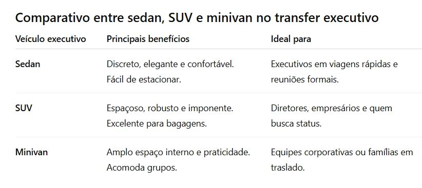 – Experiência premium: transfer executivo sem preocupações, focado no seu bem-estar.